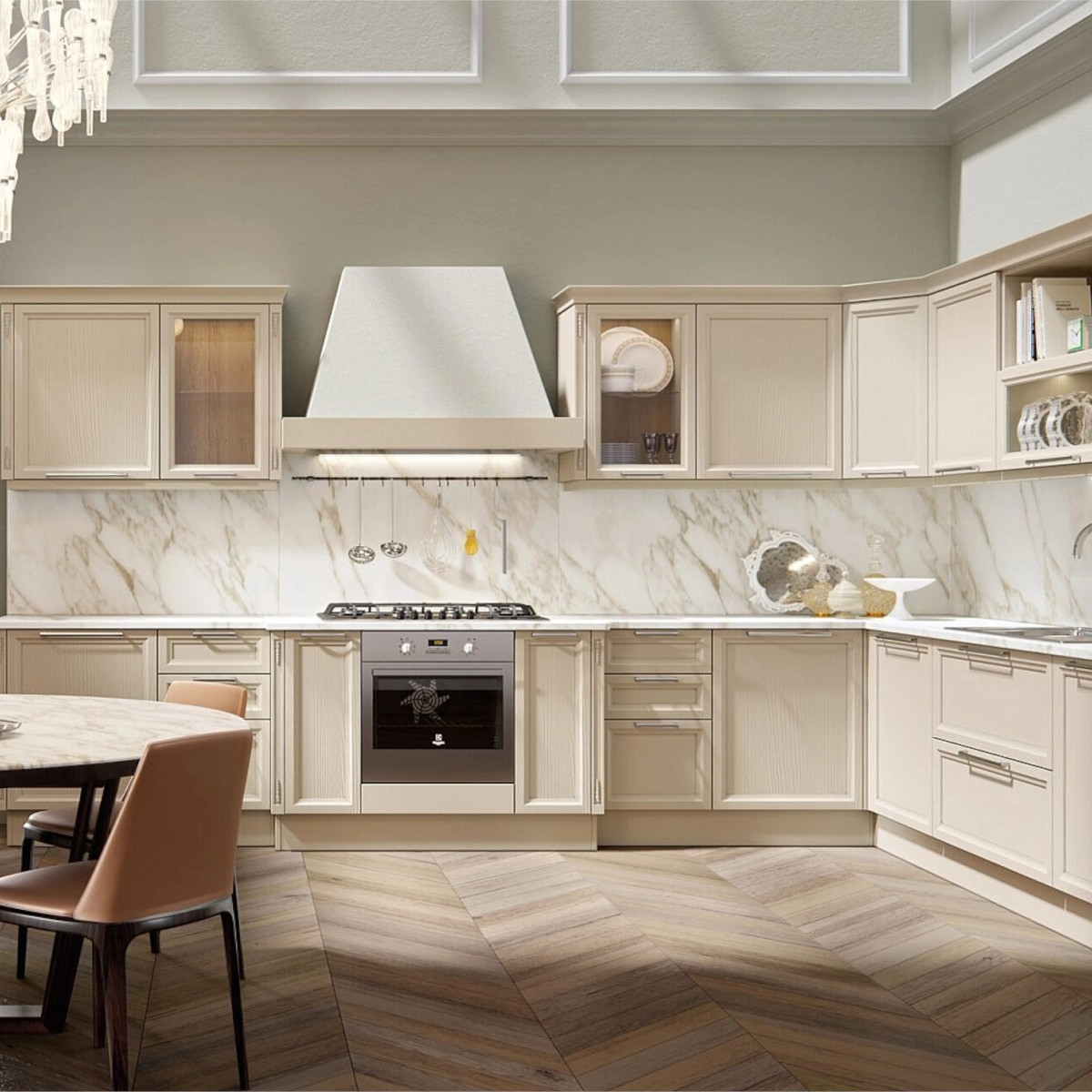 Современное прочтение классики: изысканные фасады с утонченной фрезеровкой, продуманная эргономика и технологичный комфорт. Подходит для неоклассики, классических интерьеров и ар-деко